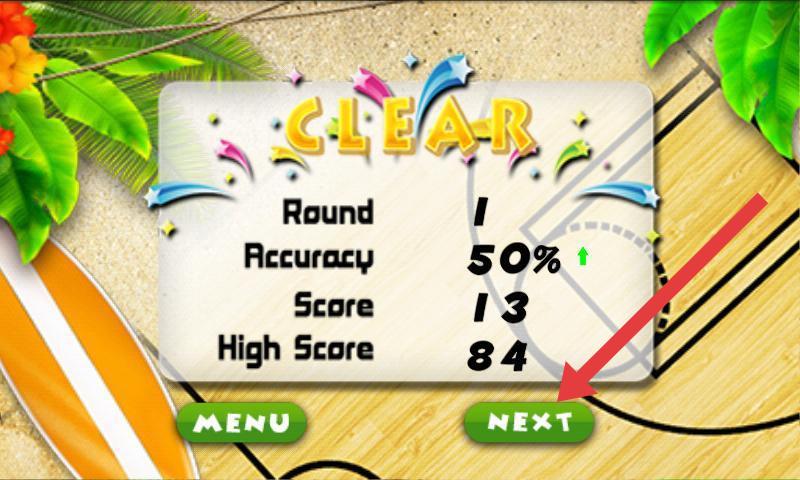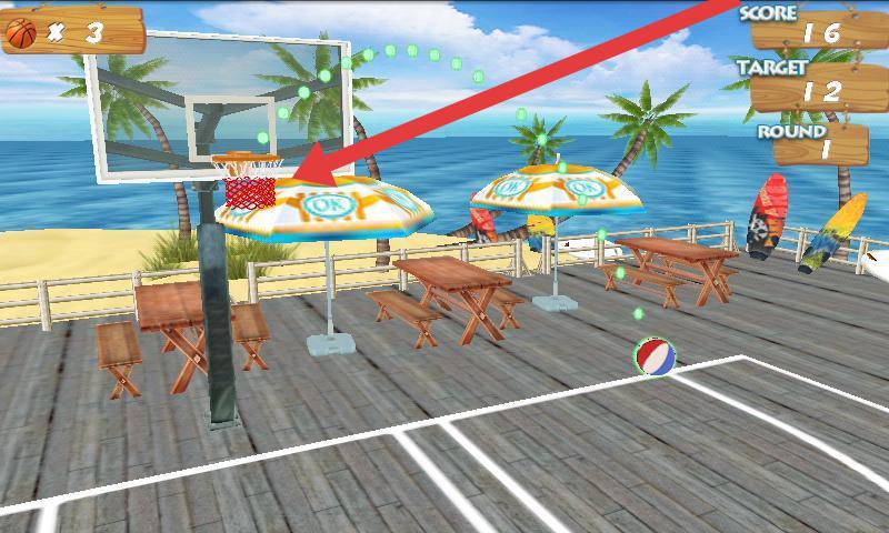 3、在海灘場(chǎng)景中,依據(jù)綠色拋物線軌跡瞄準(zhǔn)籃筐,控制投籃角度與力度,嘗試命中籃筐以積累分?jǐn)?shù)。