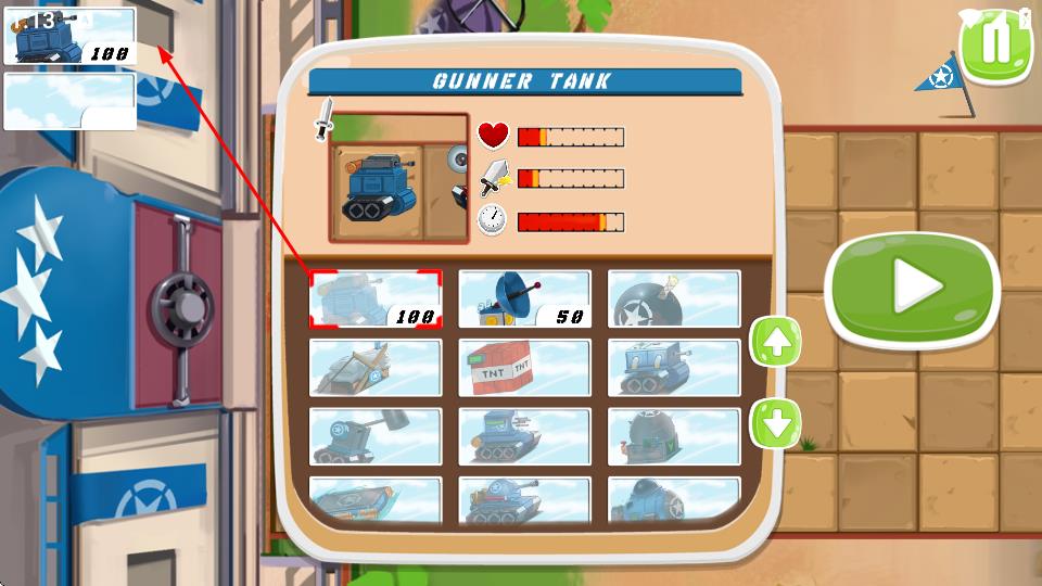 1、在坦克選擇界面,挑選坦克,消耗金幣將其部署到戰(zhàn)場方格,構(gòu)建防御進攻陣型。