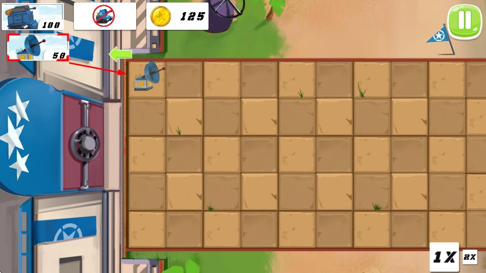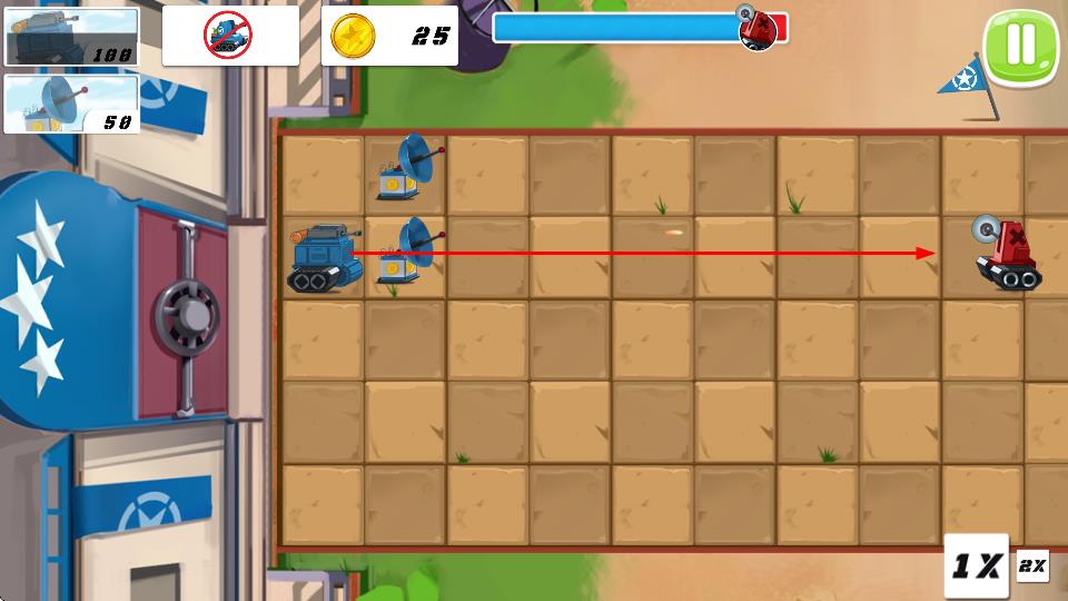 3、部署的坦克自動攻擊進入射程的敵方單位,需合理規(guī)劃坦克位置,利用射程、火力優(yōu)勢,抵御敵方推進。