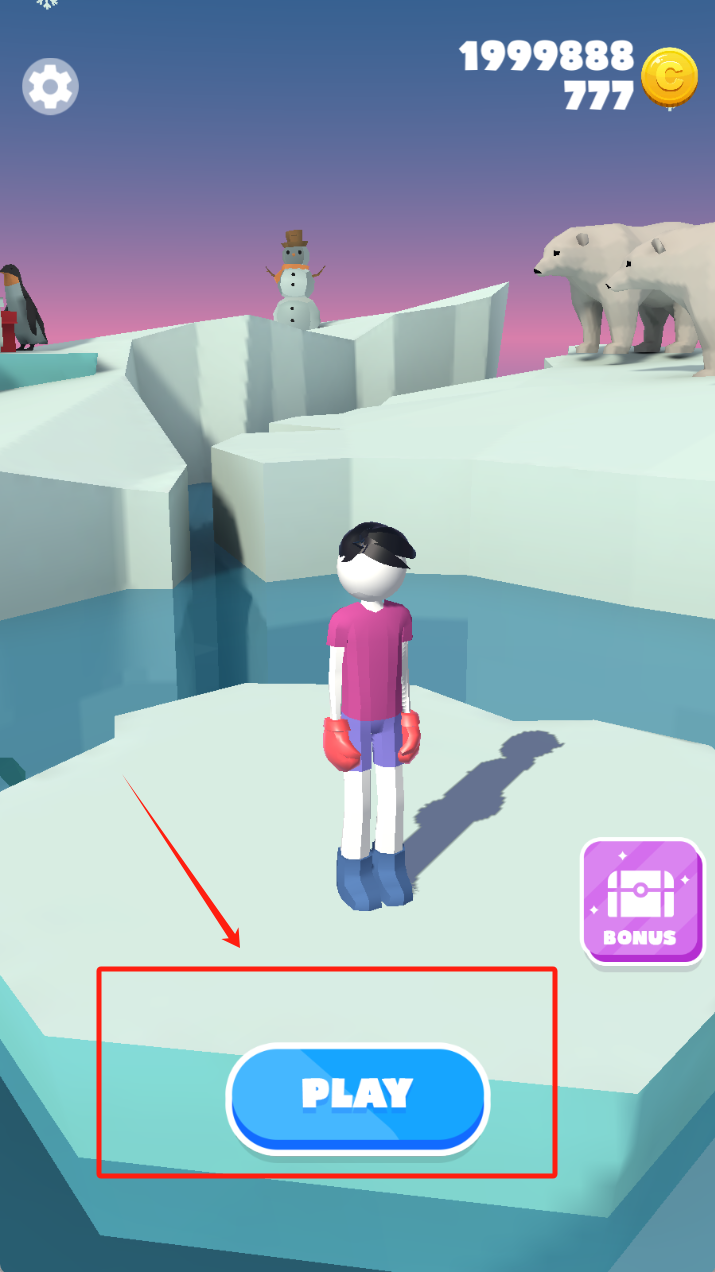 1、看到中間穿粉衣服的小人站在冰塊上時,直接點(diǎn)擊下方藍(lán)色的“PLAY”按鈕開始游戲;左上角的齒輪圖標(biāo)可進(jìn)入設(shè)置界面,右下角的“BONUS”是獎勵入口,可查看或領(lǐng)取獎勵。