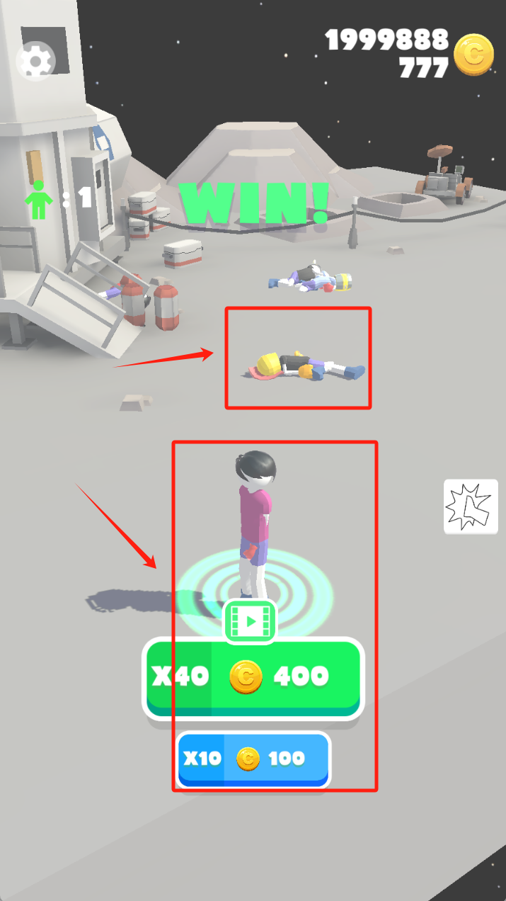 3、當(dāng)屏幕顯示“WIN”時,代表你贏得了對戰(zhàn),此時地上會躺著被擊敗的對手,可以選擇花40金幣獲得400倍獎勵,或花10金幣獲得100倍獎勵,根據(jù)自身需求選擇即可。