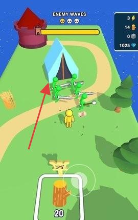 1、“布置防御”,在敵人路徑(黃色道路)旁,放置火柴人戰(zhàn)士、防御建筑,構(gòu)建防線。