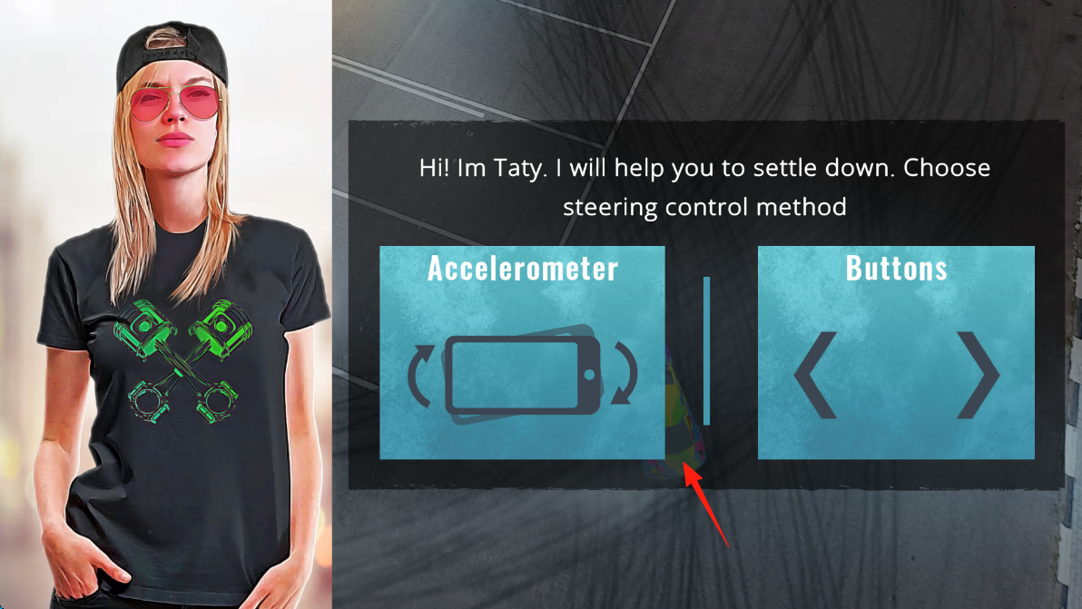 1、進入游戲初始設(shè)置,Taty引導(dǎo)選擇操控方式,有“Accelerometer(重力感應(yīng))”和“Buttons(按鍵)”可選,若選重力感應(yīng),需傾斜手機控制方向;選按鍵則用左右箭頭操作。
