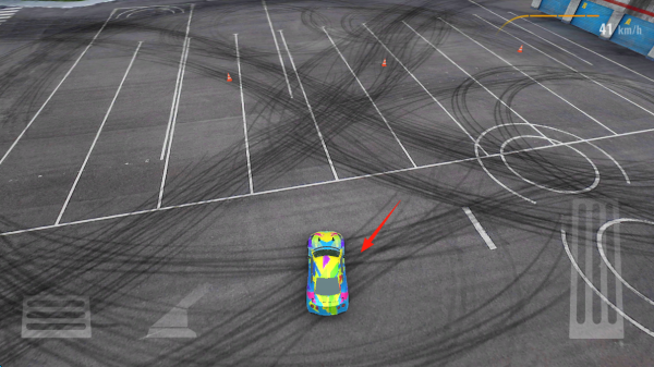 2、在空曠停車場駕駛彩色賽車,利用選定的操控方式(重力或按鍵),讓賽車在地面留下漂移軌跡,通過繞開錐桶、規(guī)劃漂移路線,積累漂移分?jǐn)?shù)。