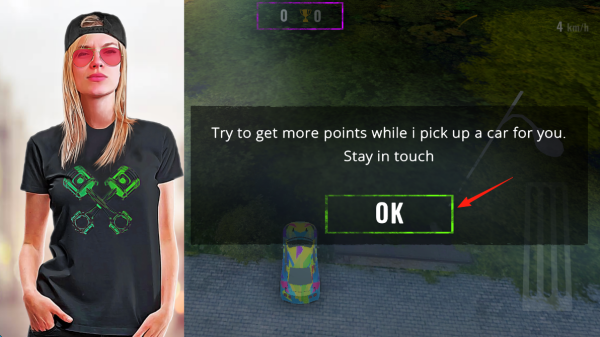 3、完成漂移挑戰(zhàn)后,Taty提示“獲取更多積分換車”,點擊“OK”確認(rèn),積分可用于解鎖更高級賽車,后續(xù)持續(xù)參與漂移、競速任務(wù),積累分?jǐn)?shù)。