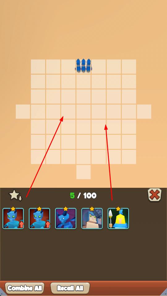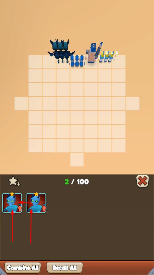 3、“英雄合成”,將同類型英雄(藍色)合并,提升等級,增強戰(zhàn)力,應(yīng)對更強敵人。