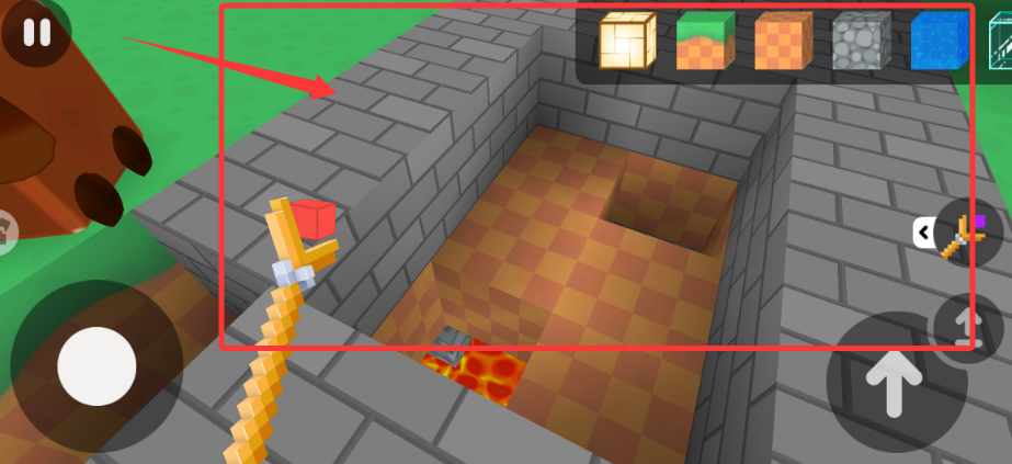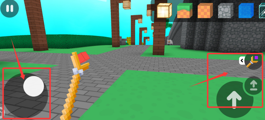 2、左手操控虛擬搖桿移動(dòng)角色,右手點(diǎn)擊功能按鈕實(shí)現(xiàn)跳躍、放置等基礎(chǔ)操作指令。