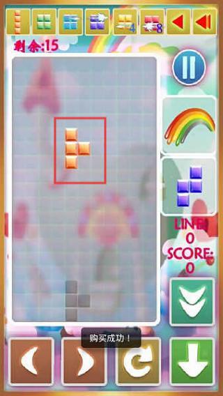 3、游玩過程中操控方塊下落,通過旋轉(zhuǎn)與移動(dòng)調(diào)整位置,使方塊排列成完整橫排完成消除,爭取更高分?jǐn)?shù)。