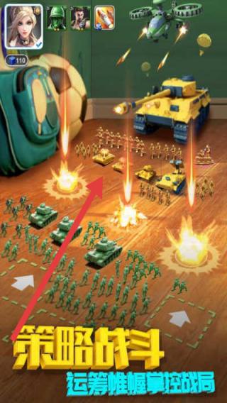 2、戰(zhàn)斗界面,利用策略指揮部隊(duì)(如士兵、坦克),按箭頭方向推進(jìn),掌控戰(zhàn)局,獲取勝利。