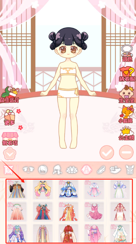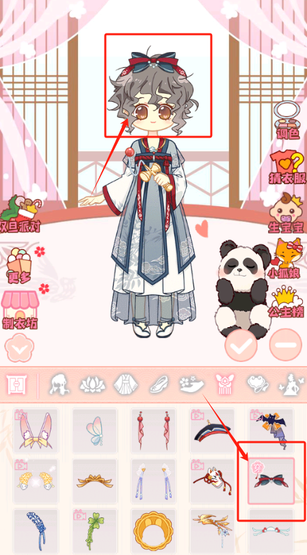 3、點(diǎn)擊紅框里的發(fā)飾為角色戴上,下方還有許多其他飾品可供選擇,讓造型更加豐富多樣。