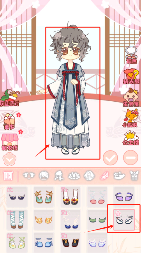 2、選擇紅框里的古風(fēng)鞋子為角色換上,旁邊的制衣坊、公主榜等選項(xiàng)可提供更多游戲功能與玩法入口。