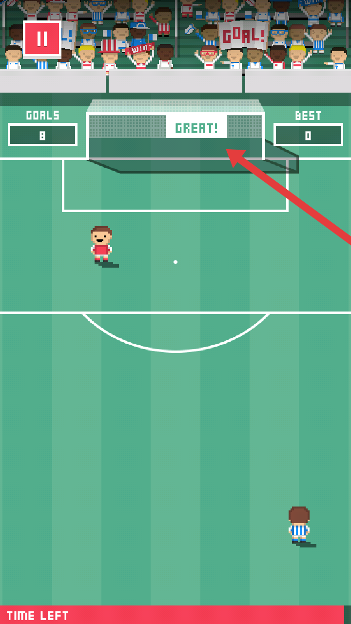 3、操控者成功將球射入球門,球門的上方會出現(xiàn)【GREAT】的提示,達成進球目標以推進游戲進程。