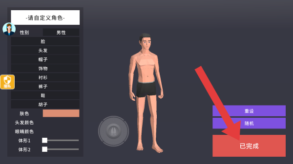 2、可設(shè)置性別(當(dāng)前為男性)、臉、頭發(fā)等外觀,有“重設(shè)”“隨機(jī)”“已完成”按鈕,用于調(diào)整、隨機(jī)生成或確認(rèn)完成角色自定義,呈現(xiàn)出角色創(chuàng)建編輯的功能場景。