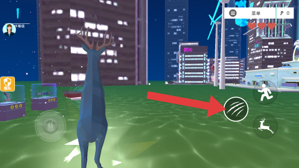 3、玩家操控鹿形角色,畫面中紅色箭頭所指圖標(biāo)可能是攻擊按鈕,此外還有移動、奔跑等操作按鈕,右上角有“菜單”選項和得分顯示(P0),背景是城市夜景。