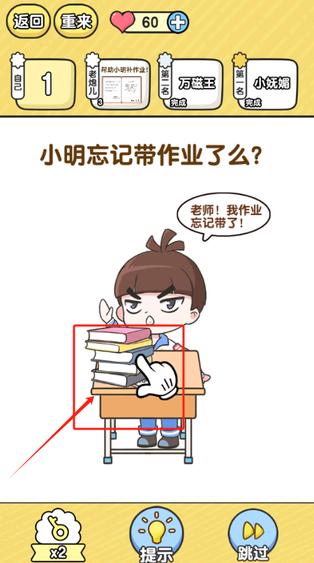 1、點擊提示按鈕尋找線索,判斷小明是不是真的忘帶作業(yè),注意不要用完60顆愛心(愛心可用于獲取提示或彌補錯誤)。