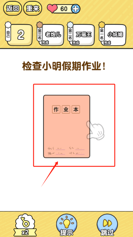 3、查看小明亂寫的作業(yè),找出所有錯題,若當前題目難以判斷,可點擊“跳過”按鈕換下一題,避免浪費時間。