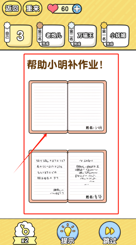 2、用紅圈標記出作業(yè)本里的問題,點擊“x2”按鈕可獲得雙倍分數(shù),若標記錯誤,點擊“重來”按鈕重新檢查。