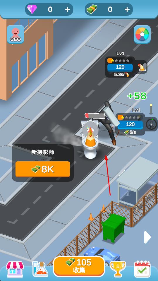2、“收集資源”,點(diǎn)擊“收集”按鈕,獲取鈔票、鉆石,用于招募員工、解鎖建筑。