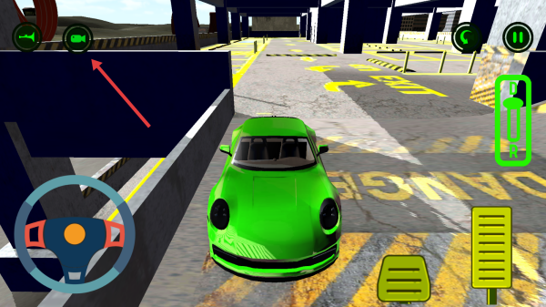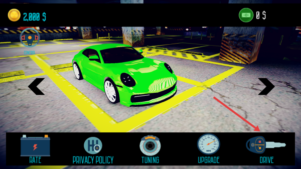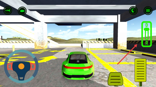 1、在車庫界面,點(diǎn)擊“DRIVE”,進(jìn)入駕駛模式,選綠色跑車,熟悉前進(jìn)(D檔)、倒車(R檔)切換。