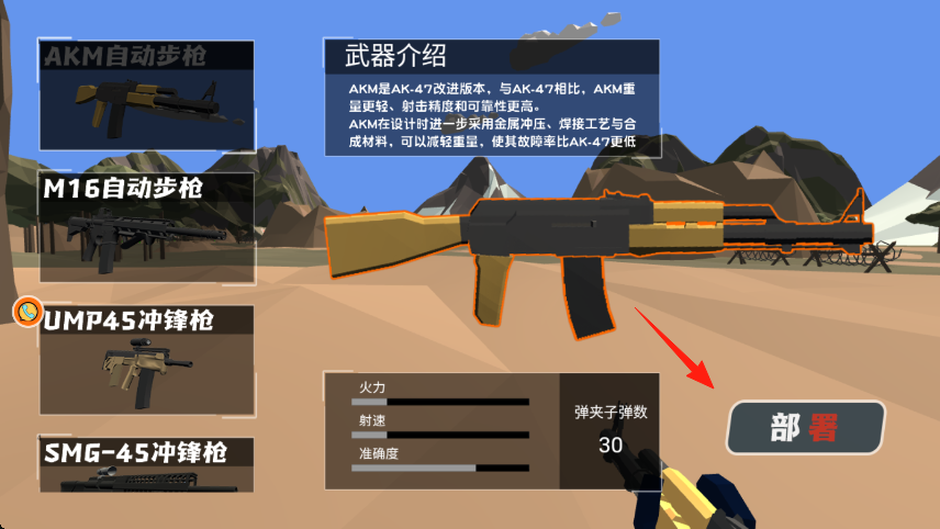 3、進(jìn)入武器詳情,查看AKM屬性(彈夾30發(fā)等),點(diǎn)擊【部署】裝備武器,進(jìn)入戰(zhàn)斗狀態(tài),應(yīng)對場景敵人。