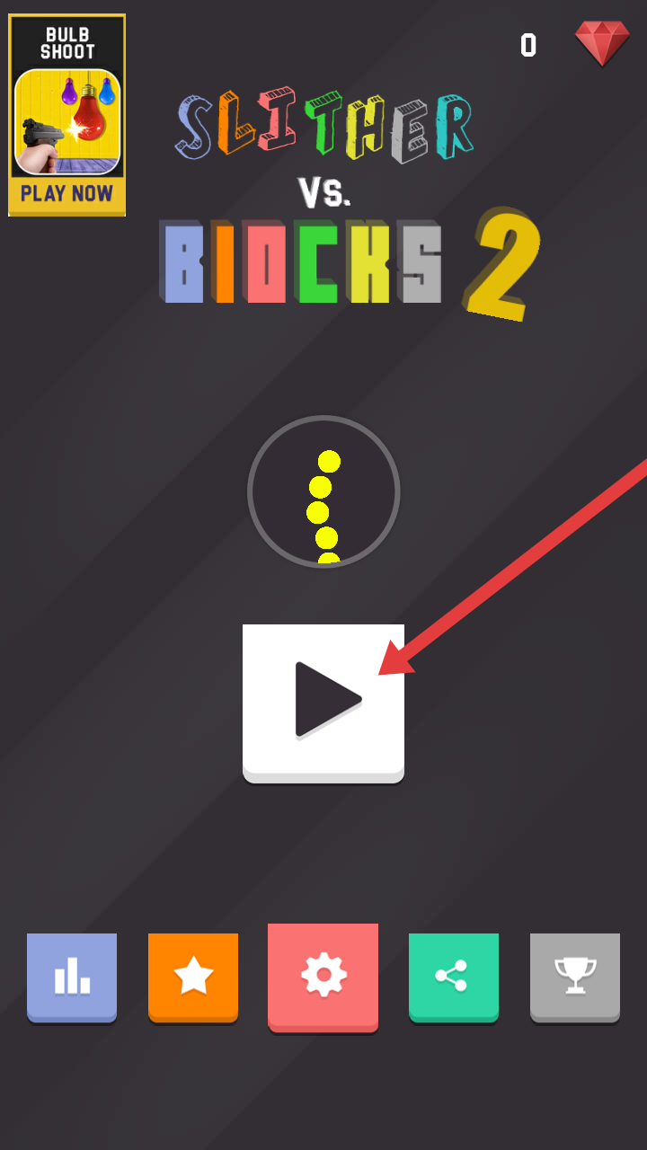 1、進(jìn)入貪吃蛇打磚塊2的游戲主界面,需要點擊中間白色帶三角的播放按鈕,開啟游戲挑戰(zhàn)。