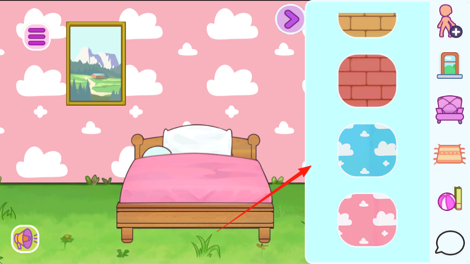 2、在右側(cè)裝飾欄,選箭頭指向的藍色云朵壁紙,點擊應(yīng)用,更換房間背景風(fēng)格。