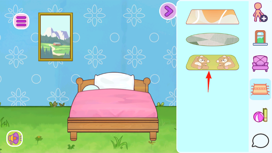 3、切換裝飾欄(右滑),選箭頭指向的小熊地毯,拖動放置房間地面,完成局部裝飾,打造個性化臥室。