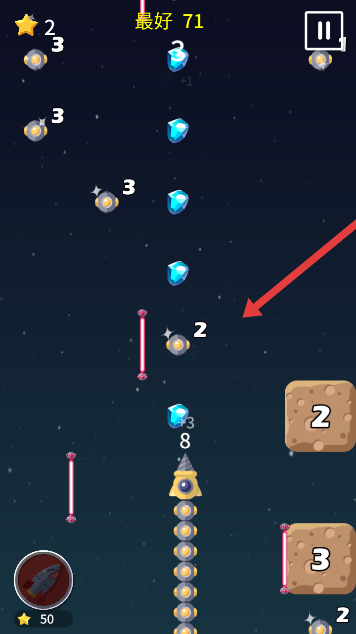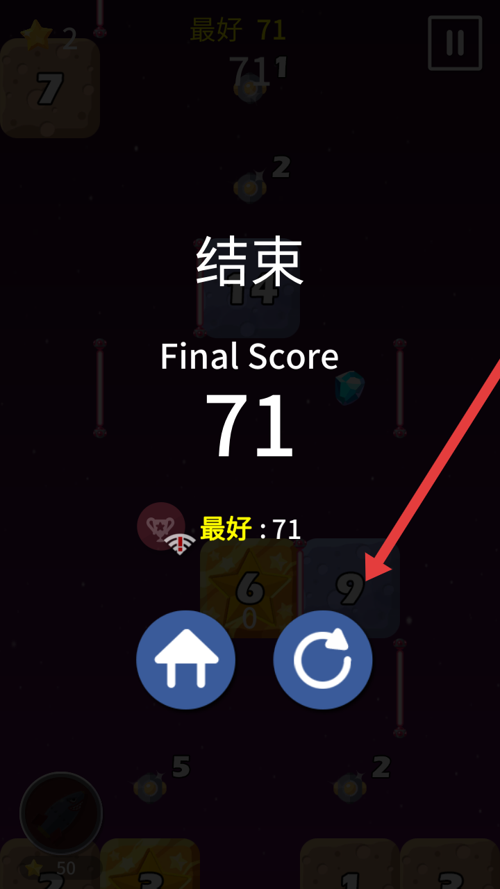 1、在游戲結(jié)束后,點(diǎn)擊界面右側(cè)帶旋轉(zhuǎn)箭頭的藍(lán)色重置按鈕,可重新開啟挑戰(zhàn),突破當(dāng)前71分的記錄。