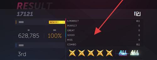 3、演奏結(jié)束后,查看【RESULT】界面數(shù)據(jù),關(guān)注【S PERFECT】等判定數(shù)量,依據(jù)結(jié)果優(yōu)化操作,沖擊更高星級(jí)。