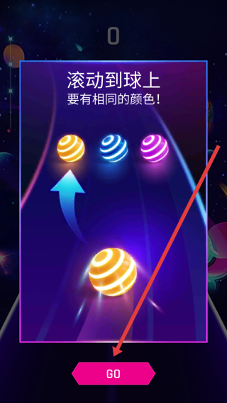 1、玩法引導(dǎo)頁(yè),閱讀“滾動(dòng)到球上要有相同的顏色!”,點(diǎn)擊【GO】,開(kāi)始音樂(lè)節(jié)奏游戲。