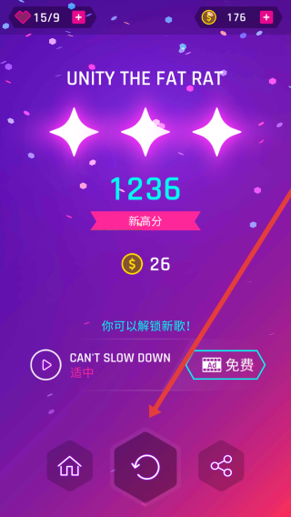 3、結(jié)算界面,查看“UNITY-THE-FAT-RAT”得分,點(diǎn)擊中間按鈕重玩,或解鎖新歌、返回主頁(yè)。