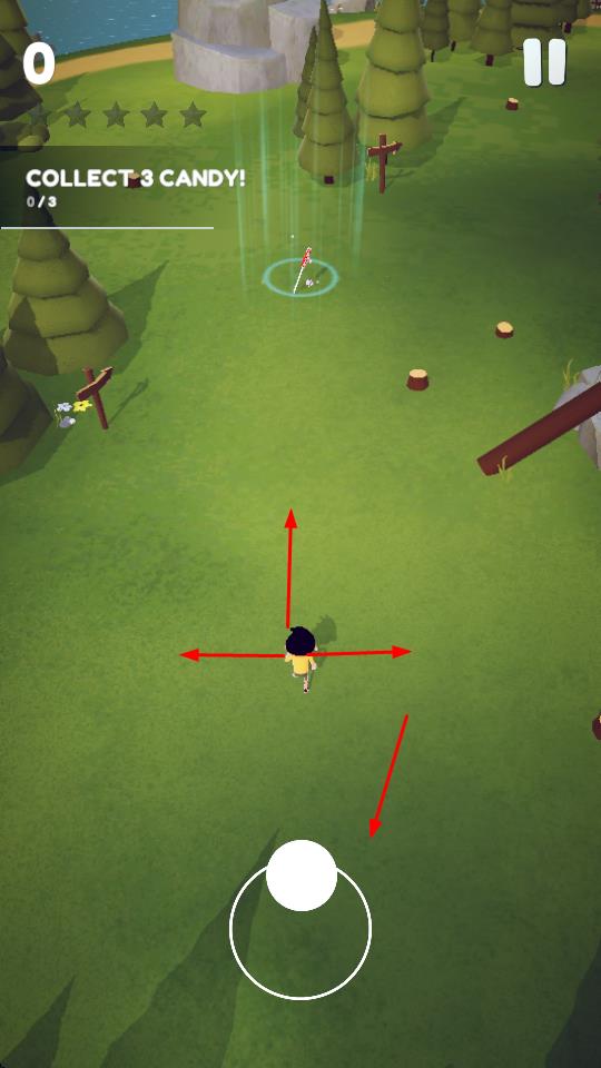 1、“任務(wù)挑戰(zhàn)”,操控卡通小人,在森林場景完成任務(wù):收集3顆糖果(CANDY)、摧毀5棵樹(TREES)。
