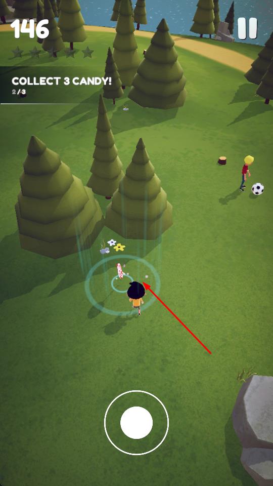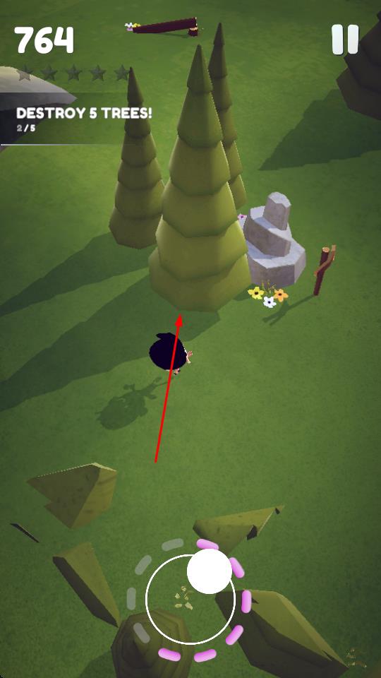3、“互動破壞”,靠近樹木點擊破壞按鈕,摧毀目標樹木;靠近糖果自動收集,完成任務(wù)進度。
