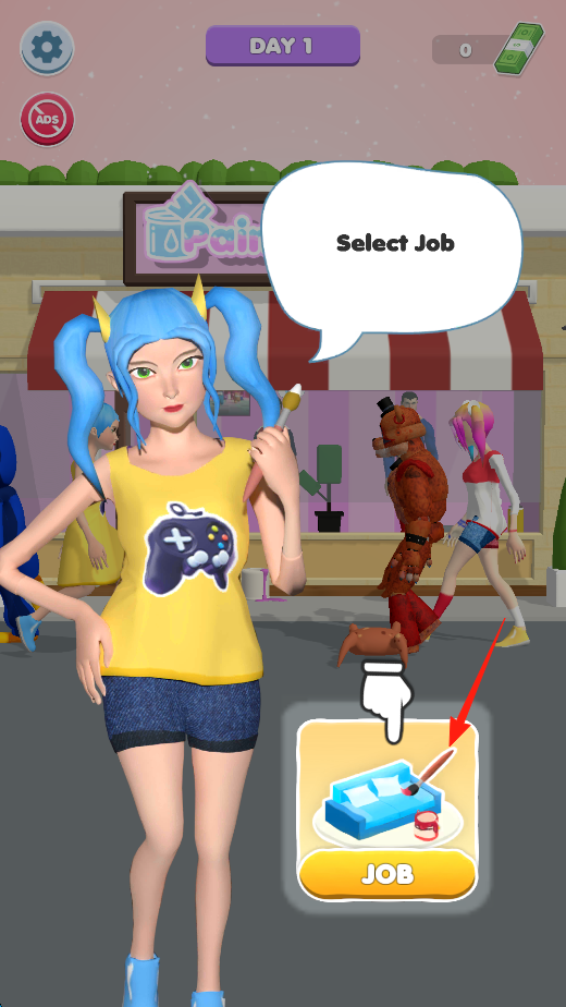 1、在街道場景首日,點擊“JOB”圖標(biāo)選擇工作,角色身處“iPaint”店鋪前,通過選擇工作開啟打工流程,借工作選擇機制,決定當(dāng)日任務(wù)方向,體驗?zāi)M生活的初始環(huán)節(jié)。
