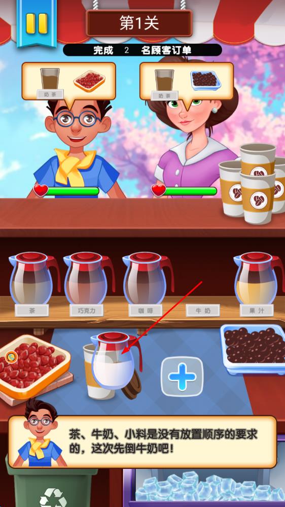 1、剛開啟奶茶店生涯,先熟悉各種原料的特性,面對第一位顧客的訂單,仔細挑選原料,按步驟一步步調制出符合要求的奶茶。
