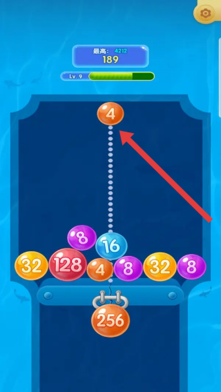 3、合成時(shí),需要瞄準(zhǔn)箭頭指向的數(shù)字球(如4),發(fā)射同數(shù)字球,合并升級(jí),沖擊更高分?jǐn)?shù)。