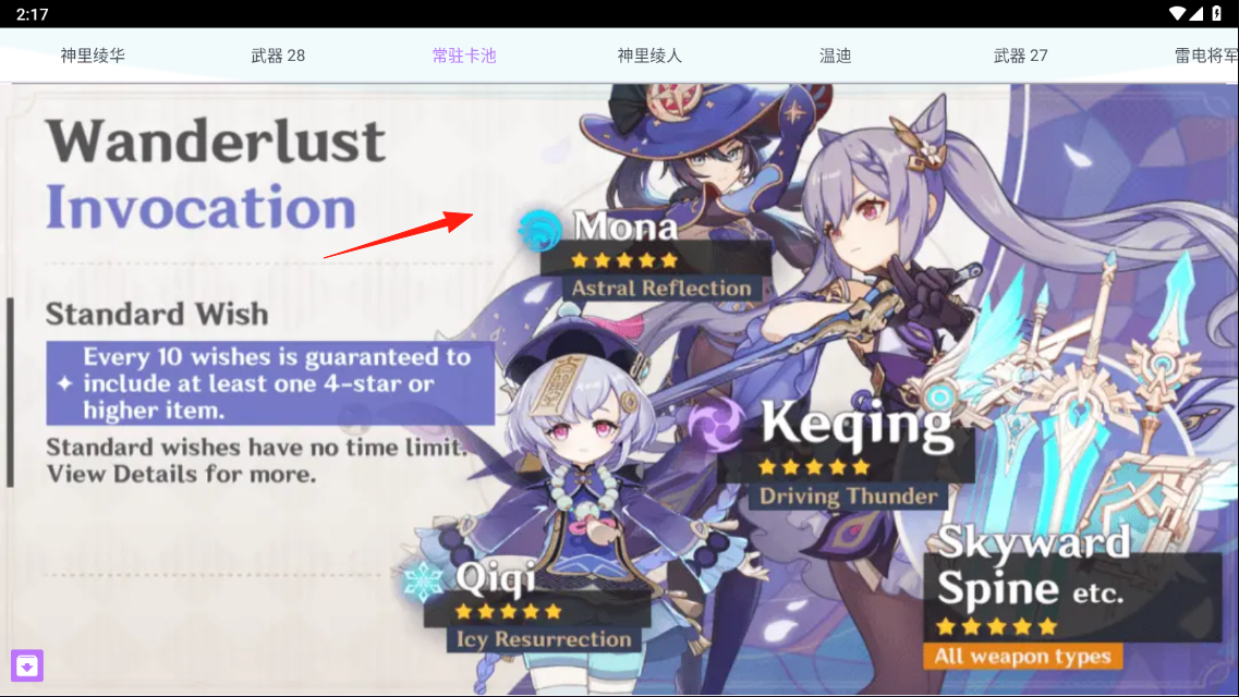 3、在常駐卡池界面,查看可抽取角色了解“每10次祈愿必出4星及以上”規(guī)則,選擇祈愿次數(shù),借常駐池?zé)o時間限制、保底機制,體驗長期收集角色的玩法,感受養(yǎng)成的持續(xù)性。