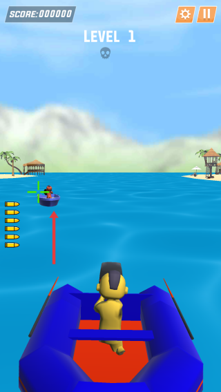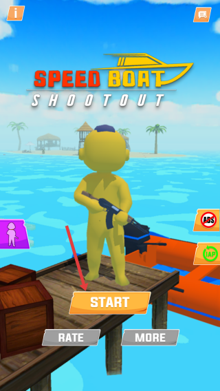 1、開局啟動:點“START”,操控黃衣角色,駕駛快艇,進(jìn)入“LEVEL1”水域。