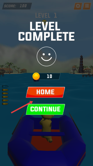3、通關(guān)選擇:“LEVEL COMPLETE后,點“HOME”回主界面或“CONTINUE”進(jìn)下一關(guān),積累金幣(10)升級。