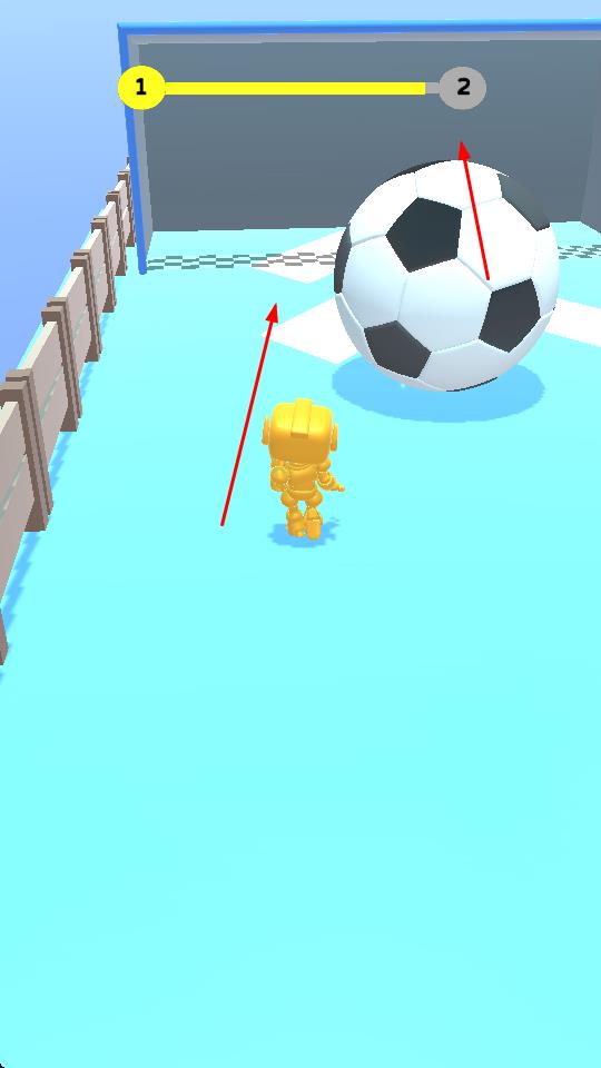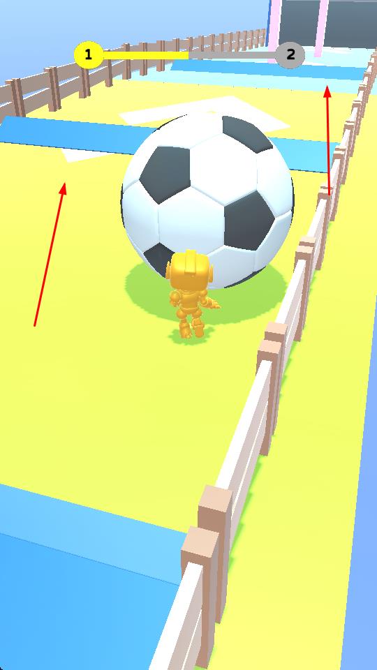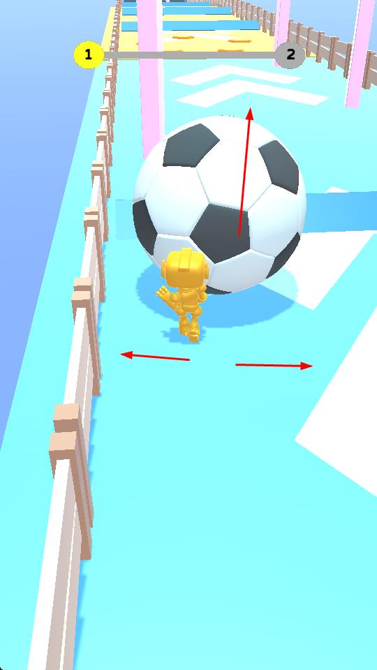 1、“足球推動(dòng)”,操控金色小人左右移動(dòng)(紅色箭頭指引),推動(dòng)足球沿跑道前進(jìn),躲避圍欄障礙。