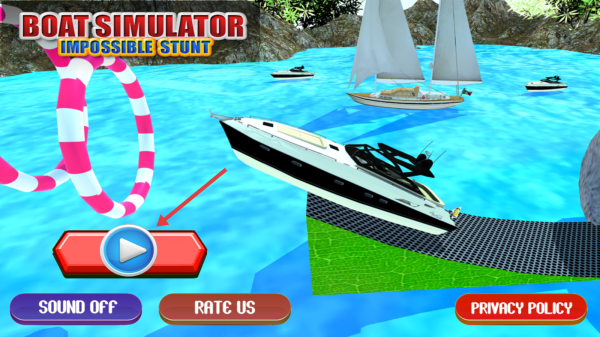 1、點擊主界面紅色播放按鈕,進(jìn)入《BOAT SIMULATOR IMPOSSIBLE STUNT》,選定游艇,開啟水上特技挑戰(zhàn)。