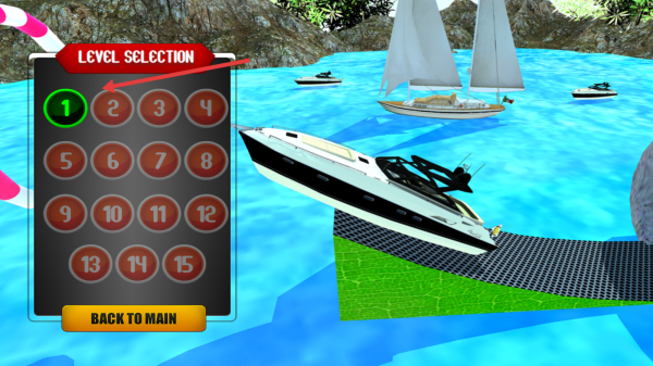 2、在關(guān)卡選擇頁,點擊【1】號關(guān)卡,進(jìn)入首關(guān)場景,準(zhǔn)備駕駛游艇,按指引完成特技任務(wù)。