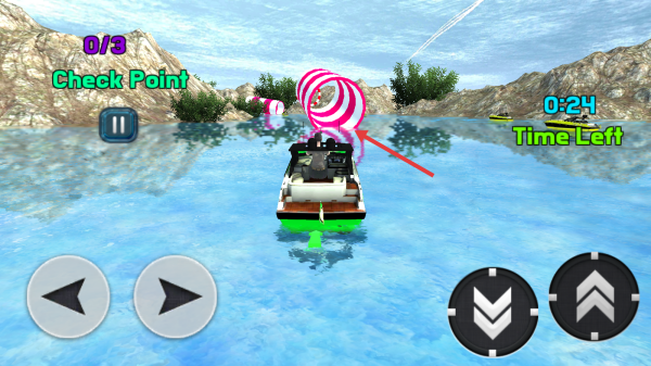 3、駕駛時,用方向按鍵控游艇前行,瞄準(zhǔn)粉色圓環(huán)checkpoint,限時內(nèi)通過以積累積分。