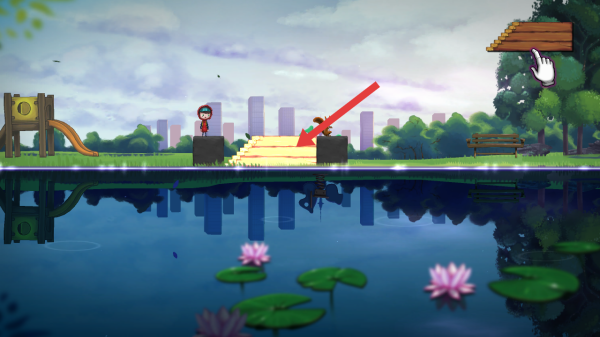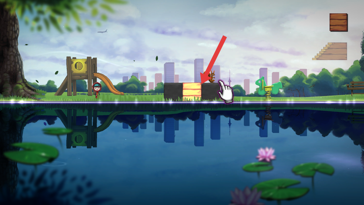 3、跟隨指引利用松鼠推動的木塊搭建基礎(chǔ)路徑,同時留意上方懸浮的木板道具,合理組合場景元素,搭建完整通道跨越水域。