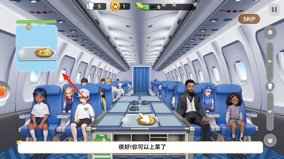 1、在初始界面,勾選協(xié)議后點擊任意位置,進入飛機餐廳場景,準備為乘客服務。