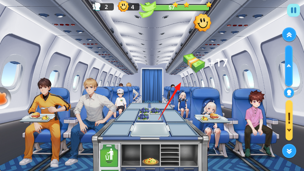 3、持續(xù)為乘客上菜,獲得金幣(如箭頭指向的收益),積累資源升級餐廳設施、解鎖新菜品。