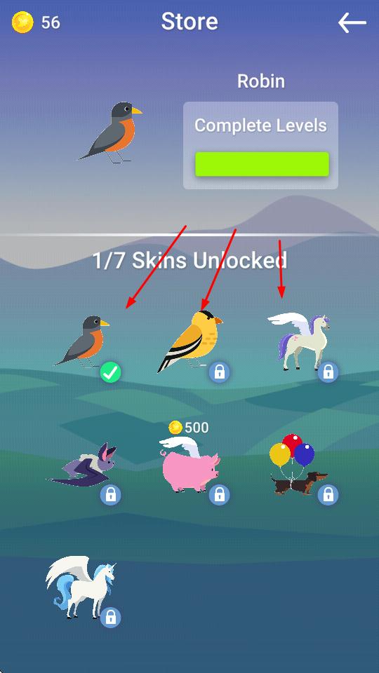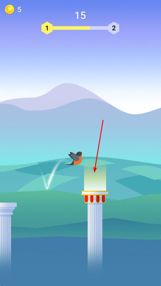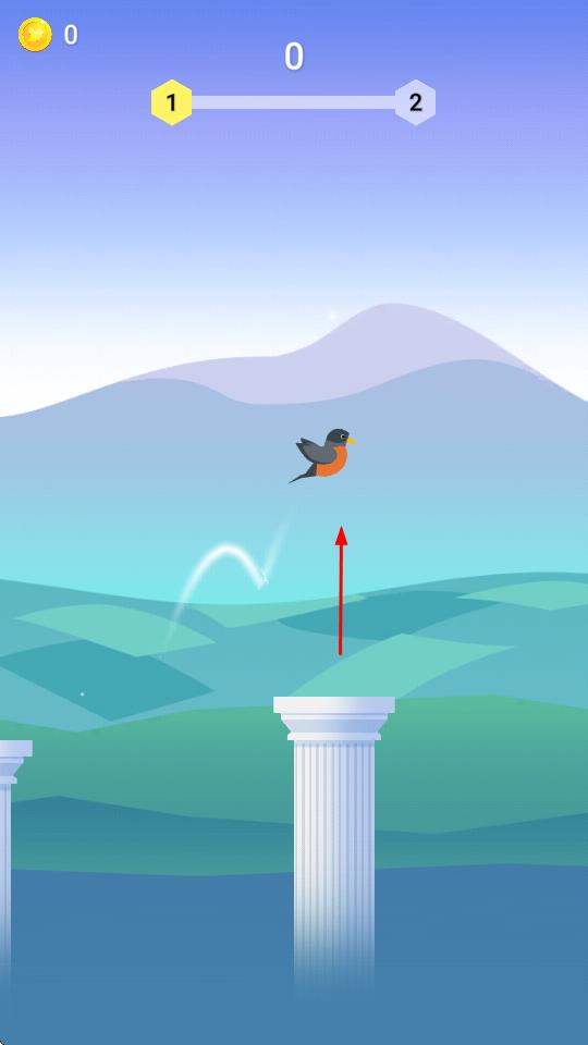 2、“平臺降落”,在不同關(guān)卡(1→2),引導(dǎo)知更鳥降落在石柱平臺上,獲取金幣(0→5→56)。