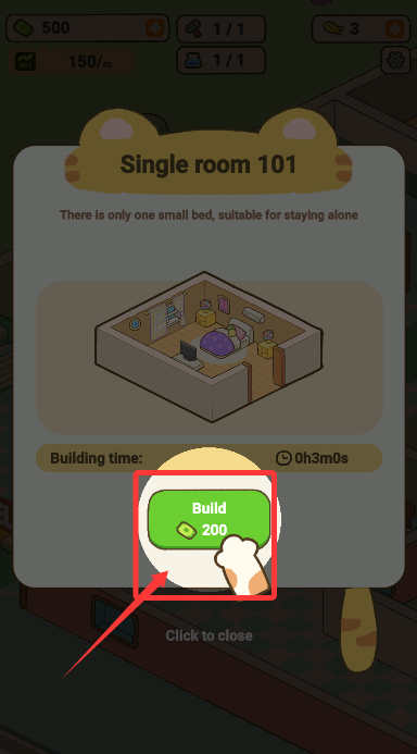 2、確認建造條件后點擊確認按鈕,支付錢幣資源啟動客房建設(shè)工程。