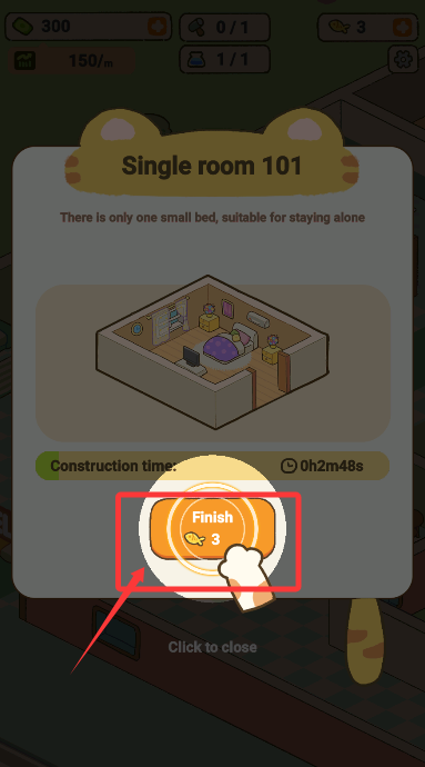 3、等待施工進度完成后,支付3單位小魚干資源點擊竣工按鈕完成房間建造。