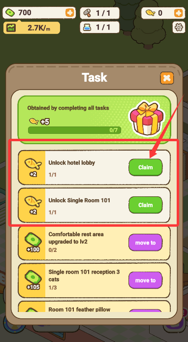 4、在成就系統(tǒng)中找到"解鎖101單人間"任務(wù),點擊領(lǐng)取按鈕獲得對應(yīng)建設(shè)獎勵。